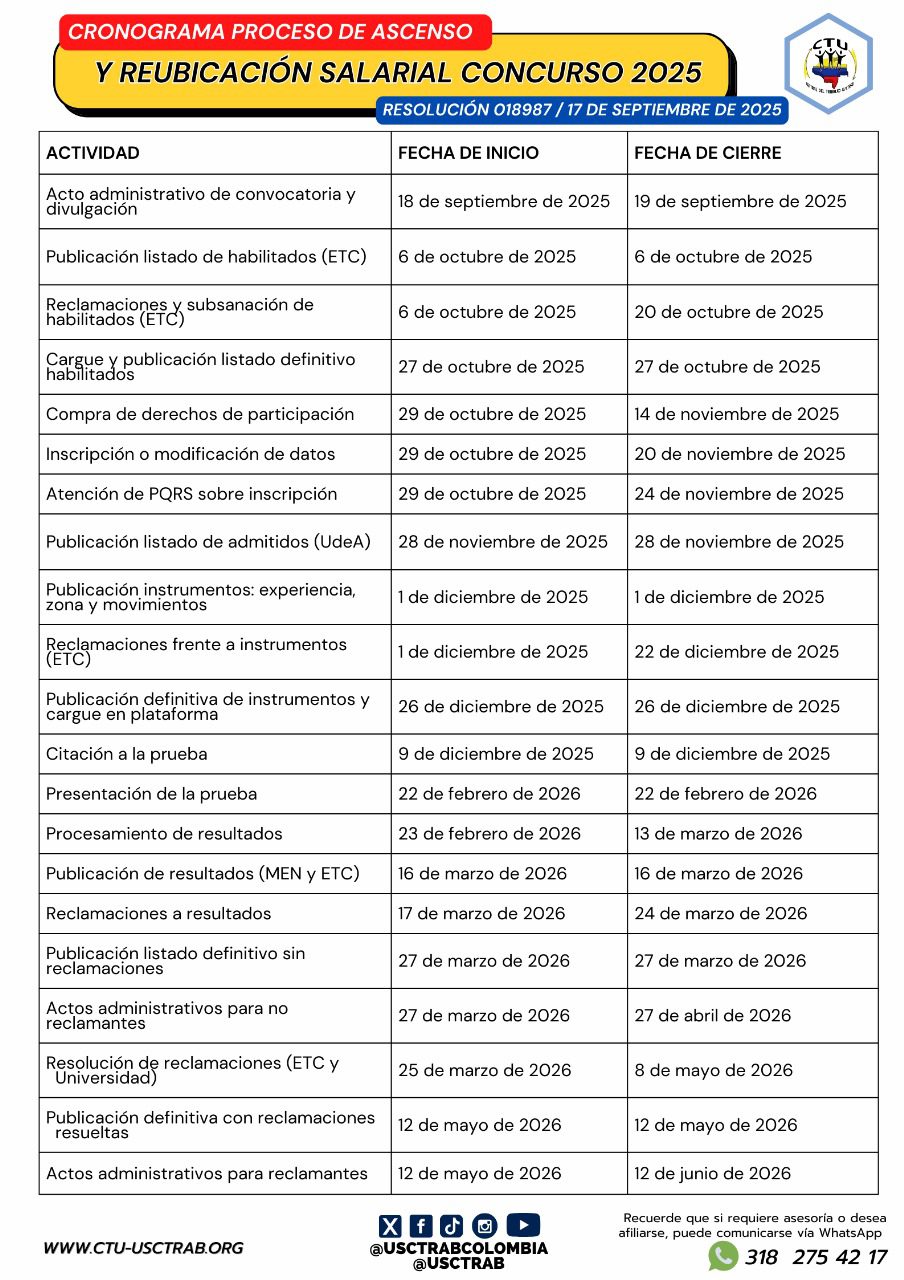 👋🏼 ¡Profe! USCTRAB INFORMA sobre el cronograma para el proceso de evaluación del Decreto 1278 de 2002 para el ascenso de grado o la reubicación del nivel salarial de los educadores oficiales: Resolución 018987 del 17 de septiembre de 2025. 👩🏻🏫 👨🏽🏫